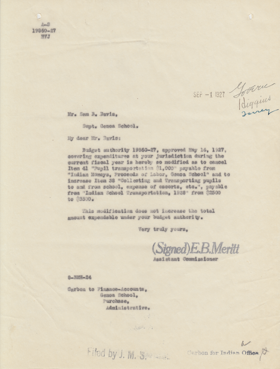 Letter from E. B. Meritt to Sam B. Davis, 1 Sept. 1927; Folder: 50496-1926-424, Box 17; Central Classified Files, 1907–1939 (NAID 300324); Office of Indian Affairs; Record Group 75; National Archives and Records Administration-Washington, DC.