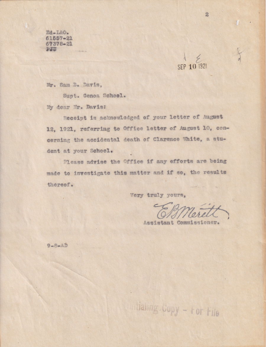 Letter from E. B. Meritt to Sam B. Davis, 10 Sept. 1921
