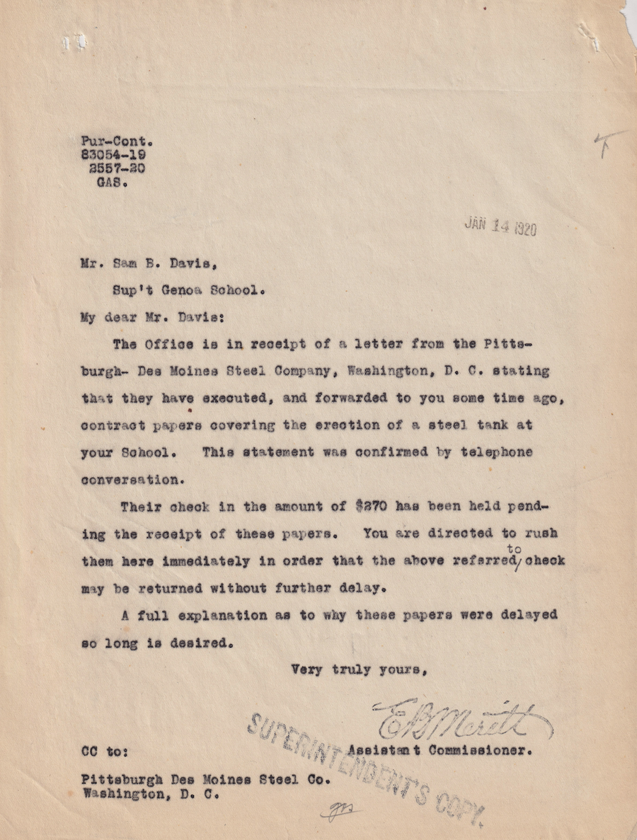 Letter from E. B. Meritt to Sam B. Davis, 14 Jan. 1920; Folder: 83054-1917-424, Box 17; Central Classified Files, 1907–1939 (NAID 300324); Office of Indian Affairs; Record Group 75; National Archives and Records Administration-Washington, DC.