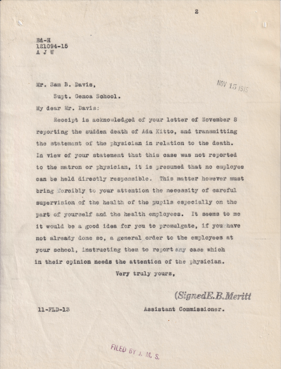 Letter from E. B. Meritt to Sam B. Davis, 15 Nov. 1915; Folder: 119702-1915-736, Box 20; Central Classified Files, 1907–1939 (NAID 300324); Office of Indian Affairs; Record Group 75; National Archives and Records Administration-Washington, DC.