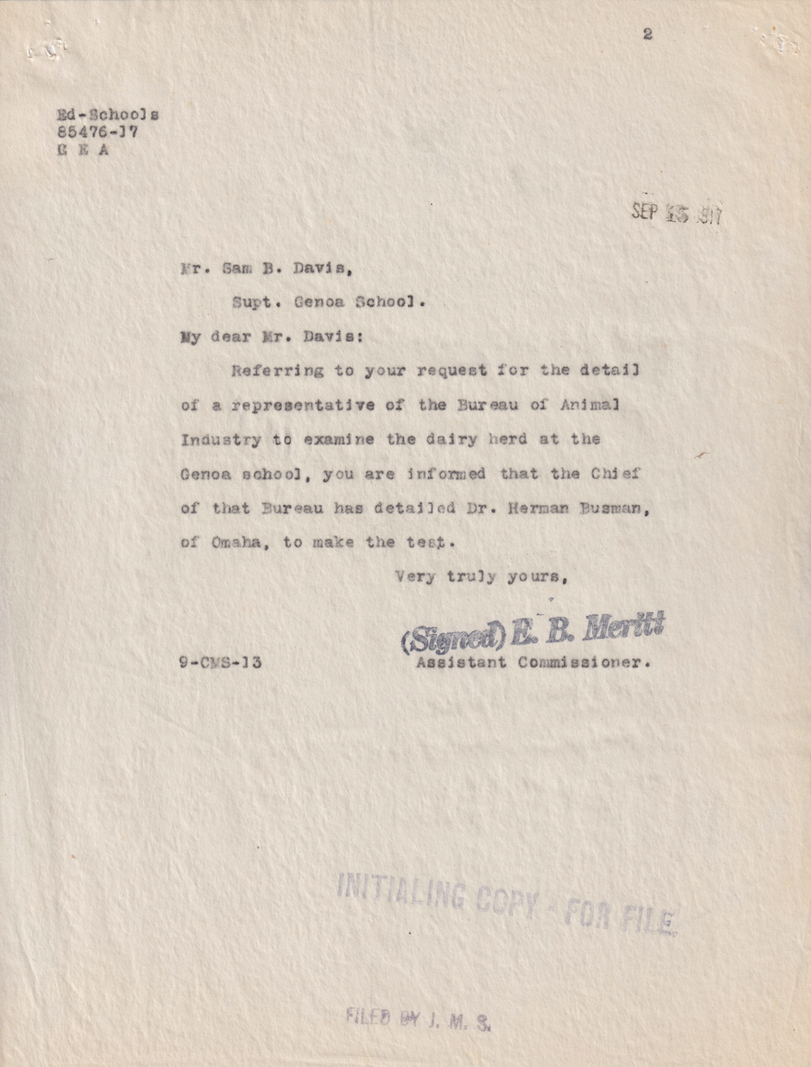 Letter from E. B. Meritt to Sam B. Davis, 15 Sept. 1917; Folder: 81455-1917-733, Box 19; Central Classified Files, 1907–1939 (NAID 300324); Office of Indian Affairs; Record Group 75; National Archives and Records Administration-Washington, DC.