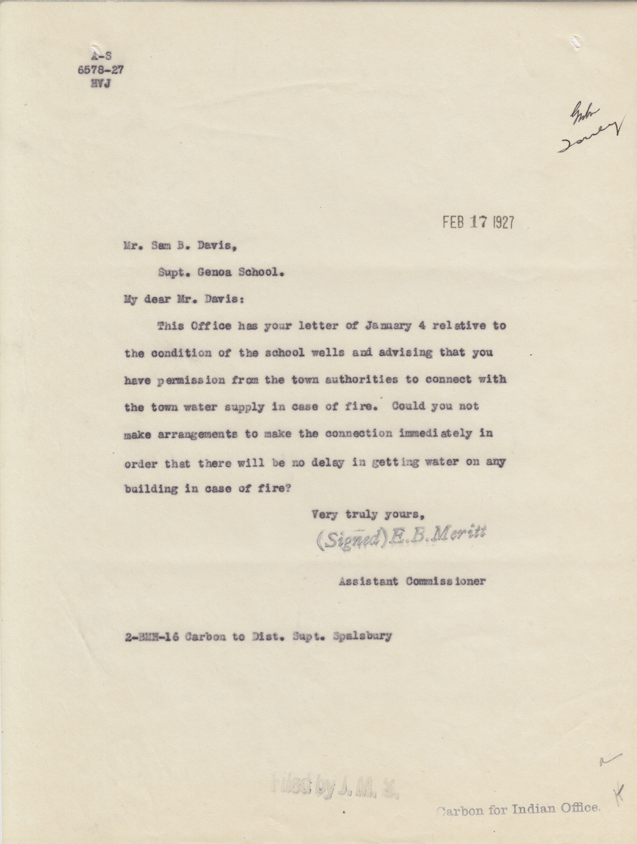 Letter from E. B Meritt to Sam B. Davis, 17 Feb. 1927; Folder: 50496-1926-424, Box 17; Central Classified Files, 1907–1939 (NAID 300324); Office of Indian Affairs; Record Group 75; National Archives and Records Administration-Washington, DC.