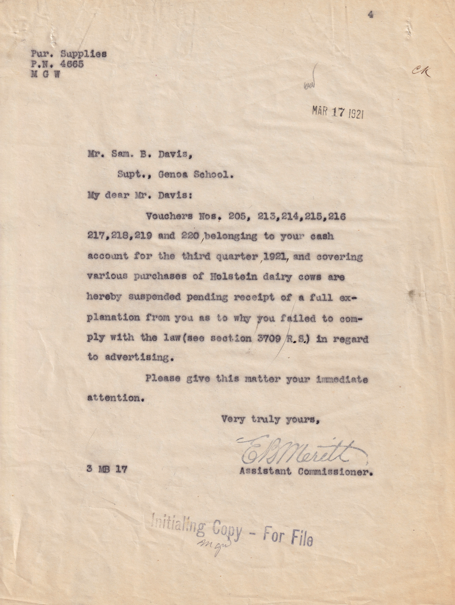 Letter from E. B. Meritt to Sam B. Davis, 17 Mar. 1921; Folder: 102442-1917-733, Box 19; Central Classified Files, 1907–1939 (NAID 300324); Office of Indian Affairs; Record Group 75; National Archives and Records Administration-Washington, DC.