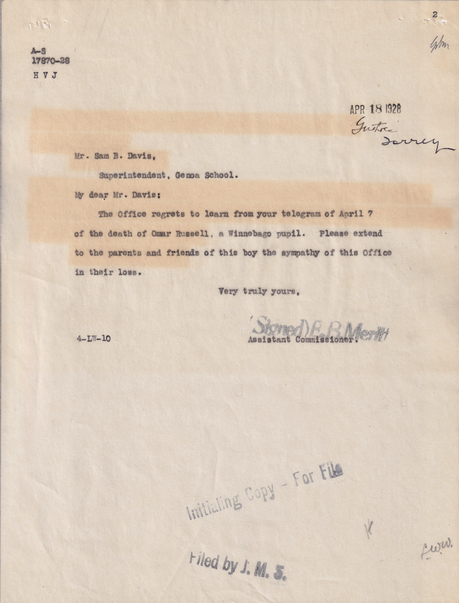 Letter from E. B. Meritt to Sam B. Davis, 18 Apr. 1928; Folder: 17870-1928-736, Box 20; Central Classified Files, 1907–1939 (NAID 300324); Office of Indian Affairs; Record Group 75; National Archives and Records Administration-Washington, DC.