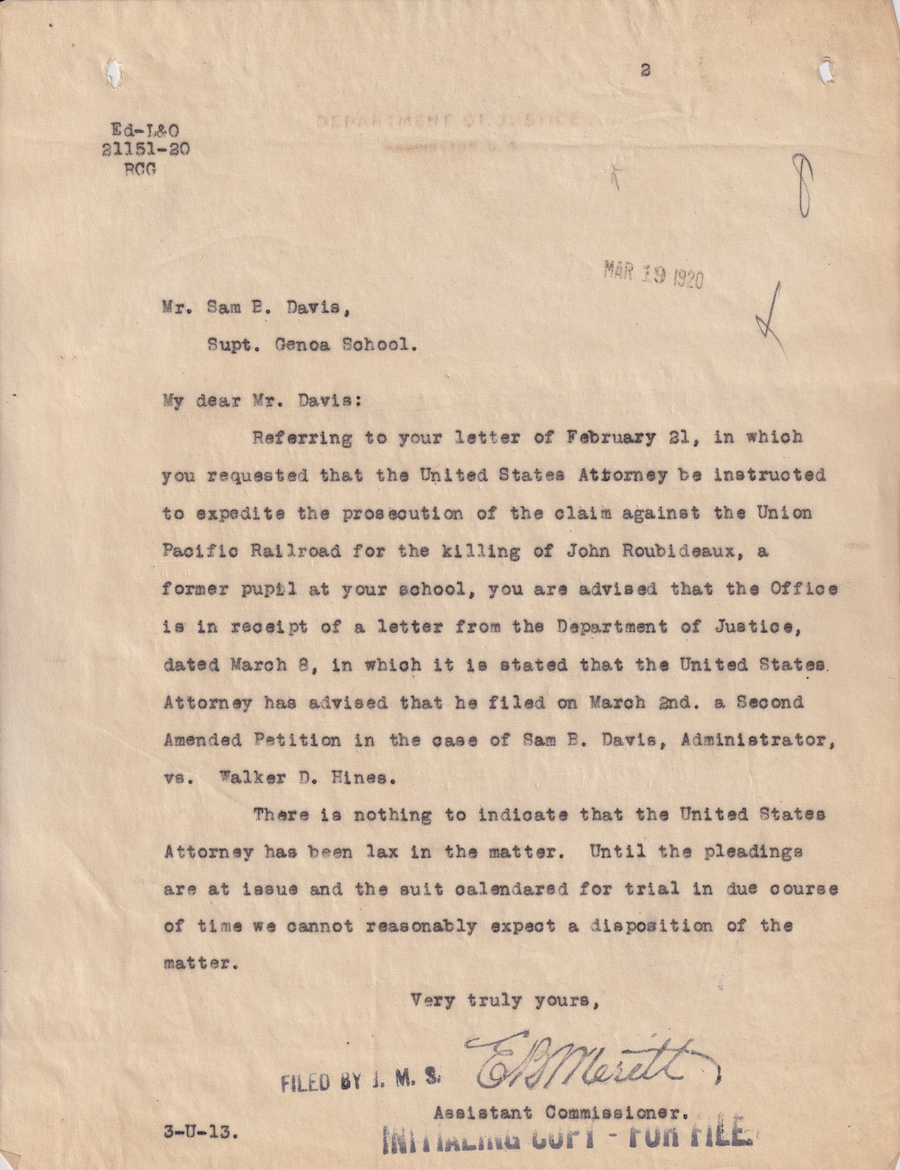 Letter from E. B. Meritt to Sam B. Davis, 19 Mar. 1920; Folder: 53707-1918-736, Box 20; Central Classified Files, 1907–1939 (NAID 300324); Office of Indian Affairs; Record Group 75; National Archives and Records Administration-Washington, DC.