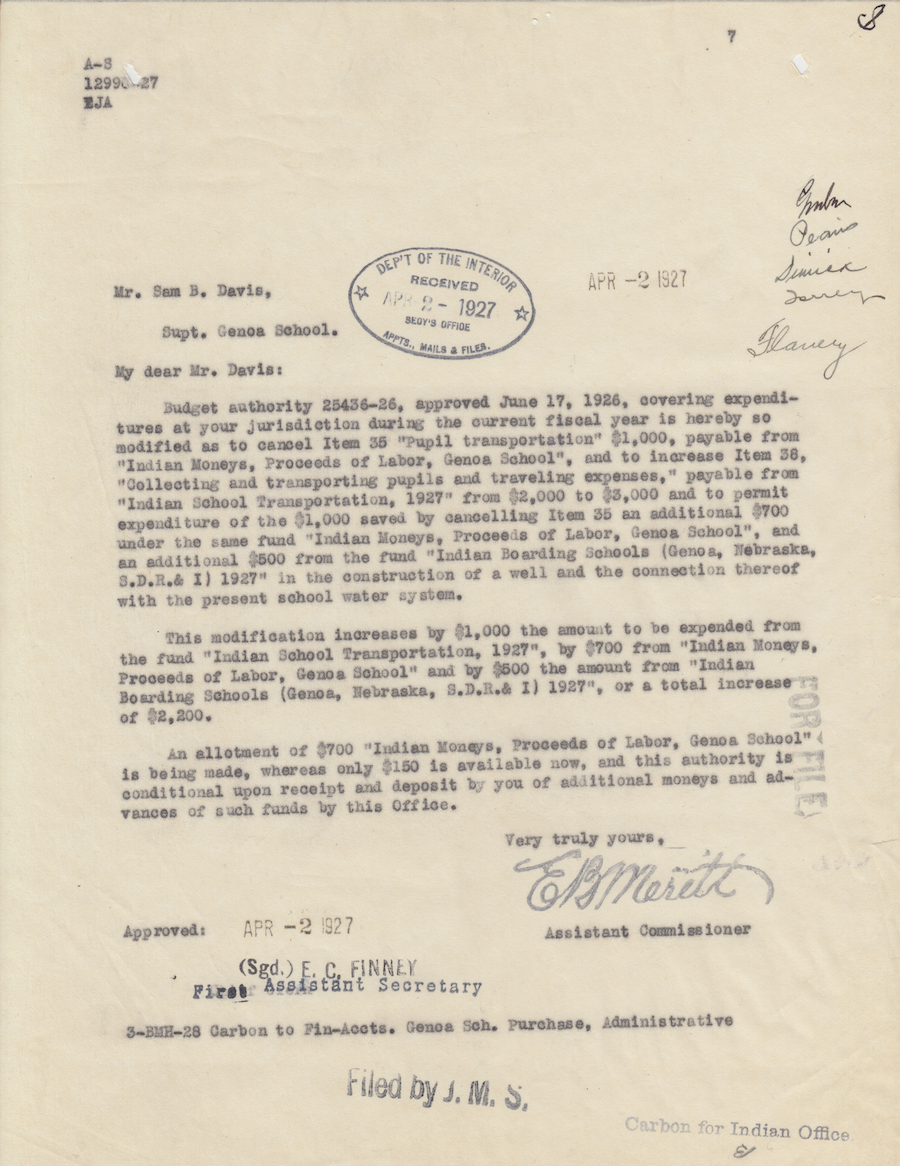 Letter from E. B. Meritt to Sam B. Davis, 2 Apr. 1927; Folder: 50496-1926-424, Box 17; Central Classified Files, 1907–1939 (NAID 300324); Office of Indian Affairs; Record Group 75; National Archives and Records Administration-Washington, DC.