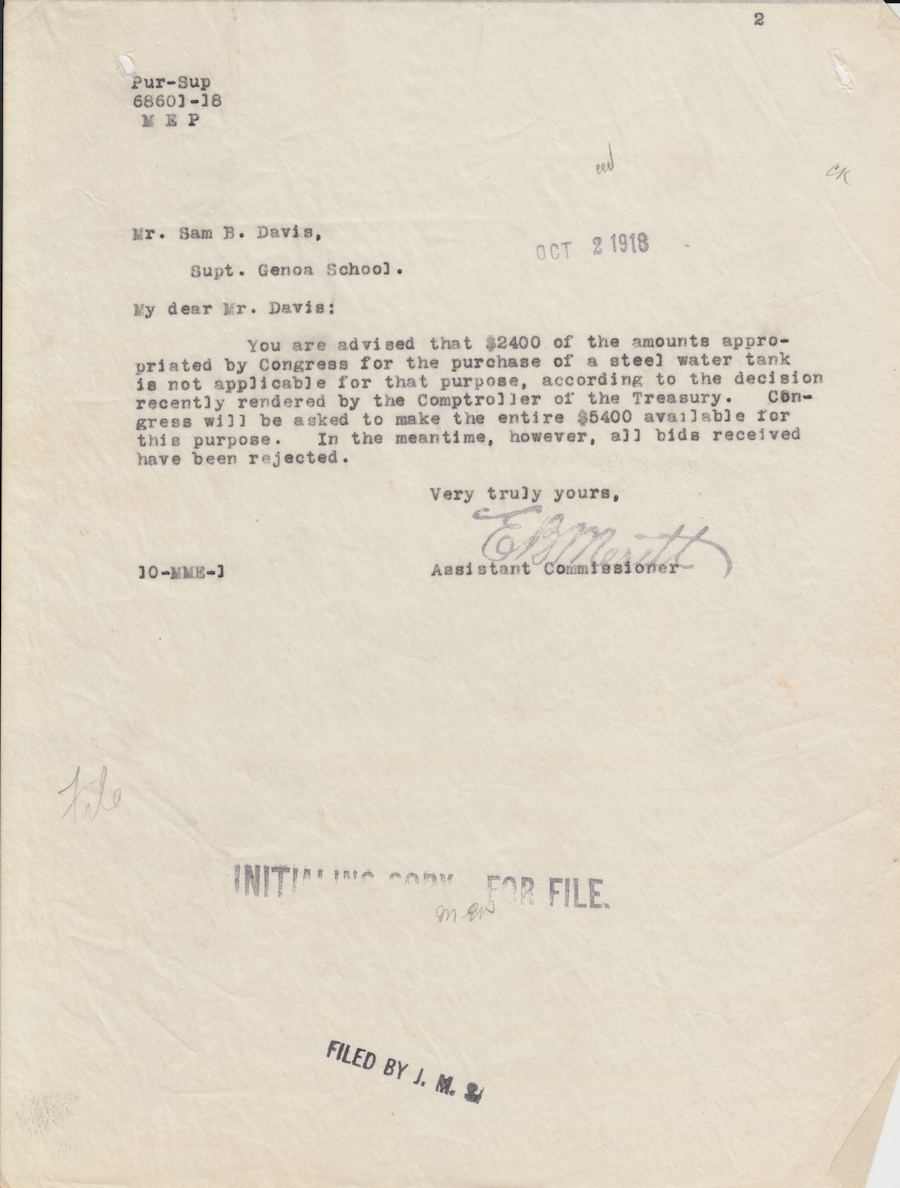 Letter from E. B. Meritt to Sam B. Davis, 2 Oct. 1918; Folder: 83054-1917-424, Box 17; Central Classified Files, 1907–1939 (NAID 300324); Office of Indian Affairs; Record Group 75; National Archives and Records Administration-Washington, DC.