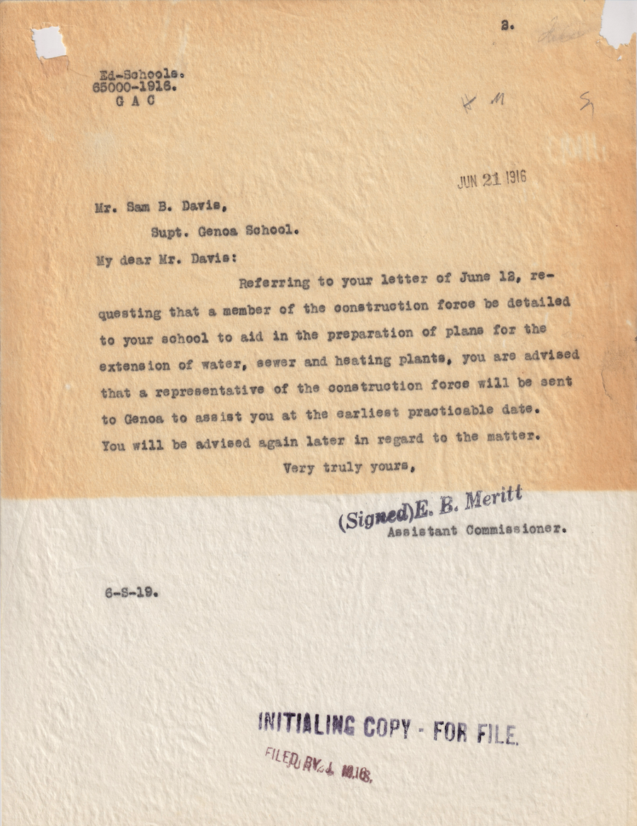 Regarding a member of the construction force being sent to the school to aid in the extension of water, sewer, and heating plants.Identifier:
