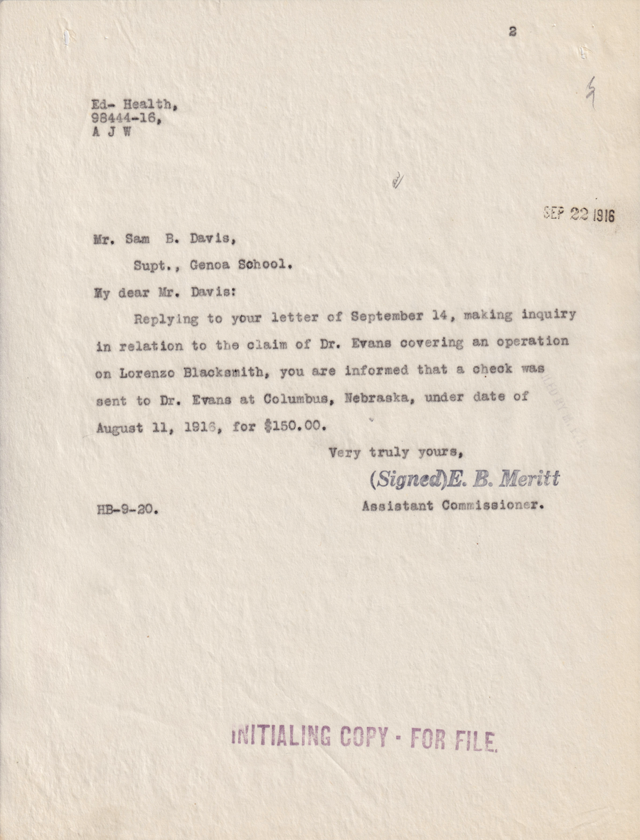 Letter from E. B. Meritt to Sam B. Davis, 22 Sept. 1916; Folder: 28797-1916-732, Box 19; Central Classified Files, 1907–1939 (NAID 300324); Office of Indian Affairs; Record Group 75; National Archives and Records Administration-Washington, DC.