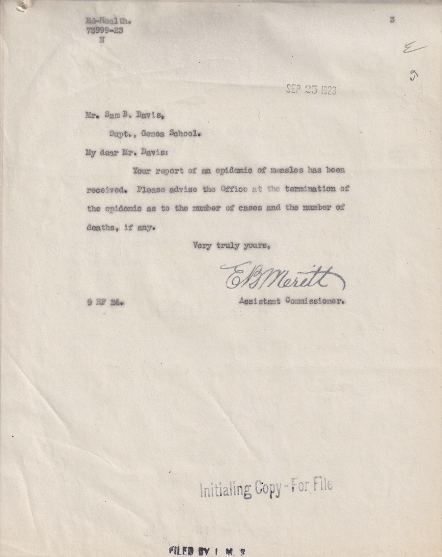 Letter from E. B. Meritt to Sam B. Davis, 25 Sept. 1923; Folder: 73999-1923-731, Box 19; Central Classified Files, 1907–1939 (NAID 300324); Office of Indian Affairs; Record Group 75; National Archives and Records Administration-Washington, DC.