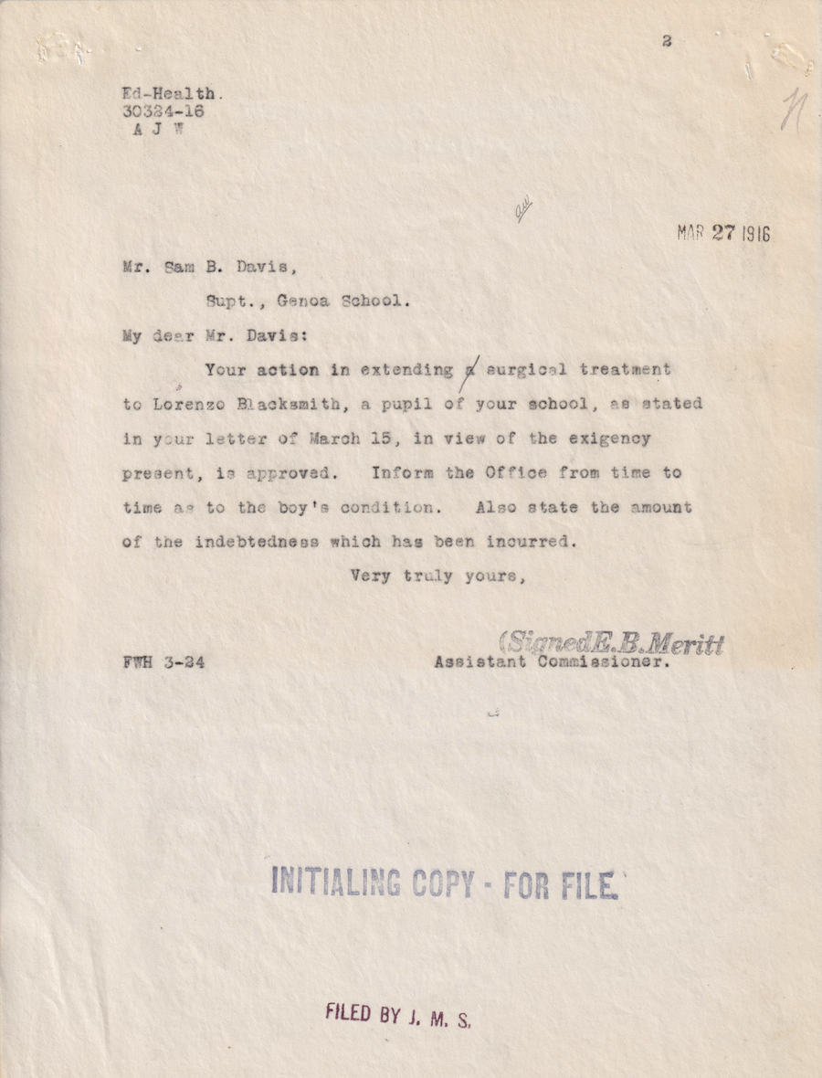 Letter from E. B. Meritt to Sam B. Davis, 27 Mar. 1916; Folder: 28797-1916-732, Box 19; Central Classified Files, 1907–1939 (NAID 300324); Office of Indian Affairs; Record Group 75; National Archives and Records Administration-Washington, DC.