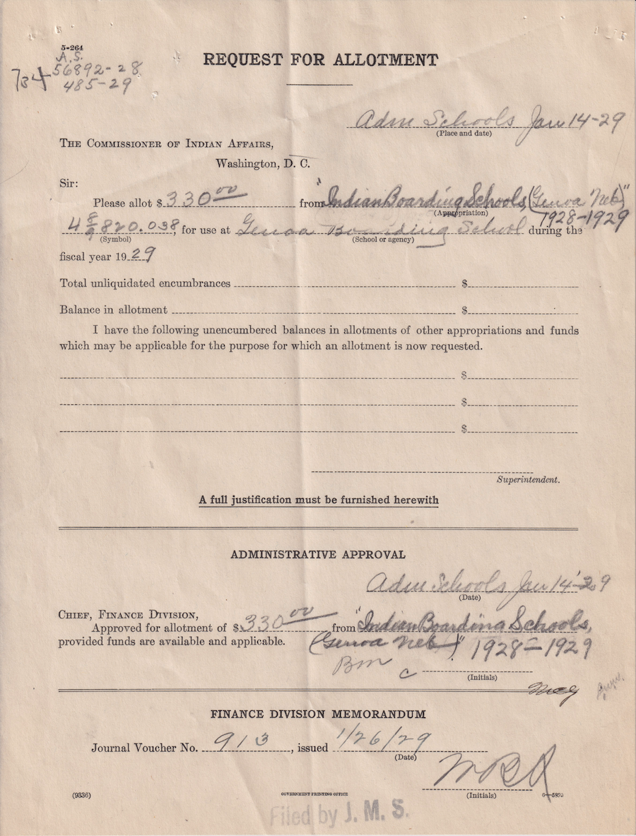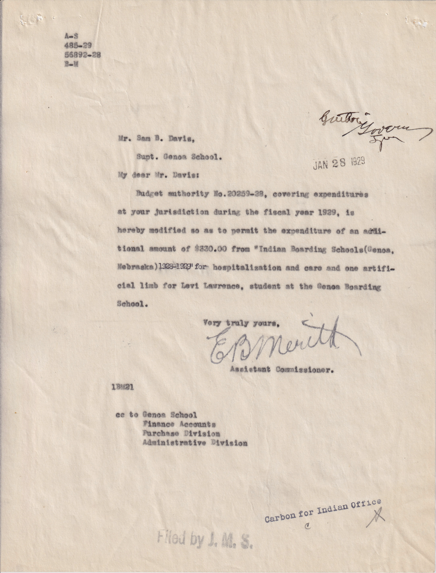 Letter from E. B. Meritt to Sam B. Davis, 28 Jan. 1929; Folder: 56892-1928-734, Box 20; Central Classified Files, 1907–1939 (NAID 300324); Office of Indian Affairs; Record Group 75; National Archives and Records Administration-Washington, DC.