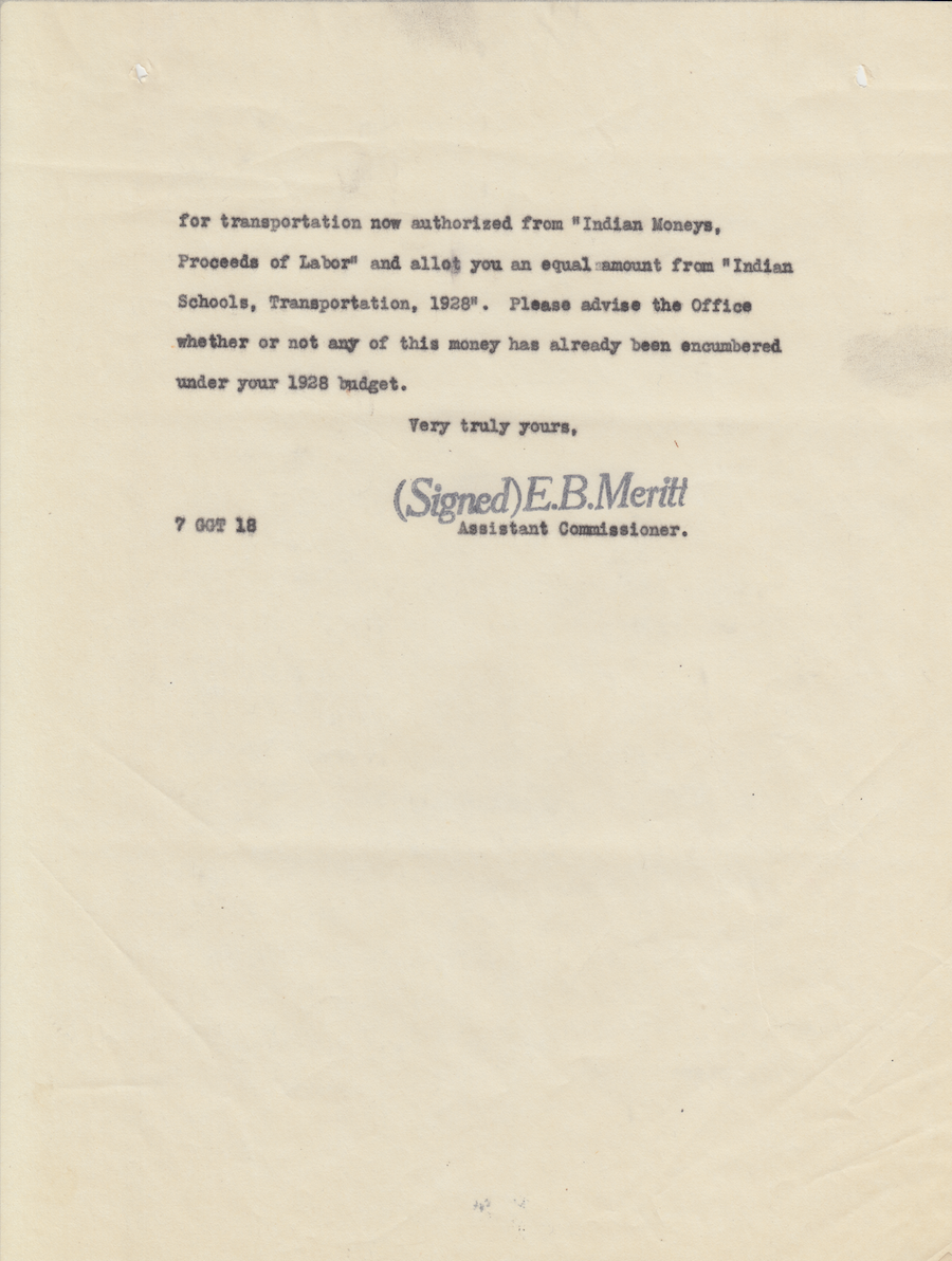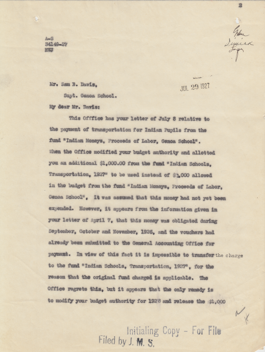 Letter from E. B. Meritt to Sam B. Davis, 29 July 1927; Folder: 50496-1926-424, Box 17; Central Classified Files, 1907–1939 (NAID 300324); Office of Indian Affairs; Record Group 75; National Archives and Records Administration-Washington, DC.