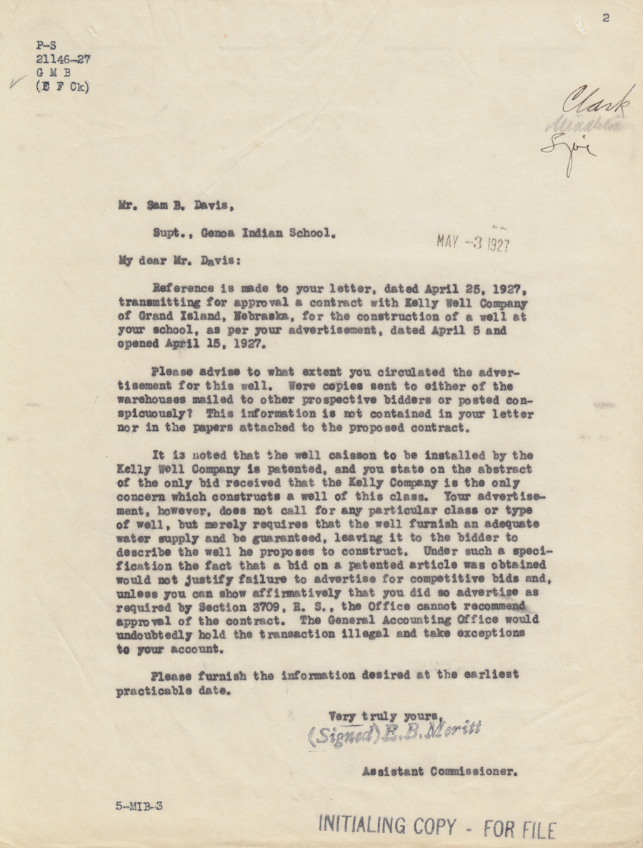 Letter from E. B. Meritt to Sam B. Davis, 3 May 1927; Folder: 50496-1926-424, Box 17; Central Classified Files, 1907–1939 (NAID 300324); Office of Indian Affairs; Record Group 75; National Archives and Records Administration-Washington, DC.