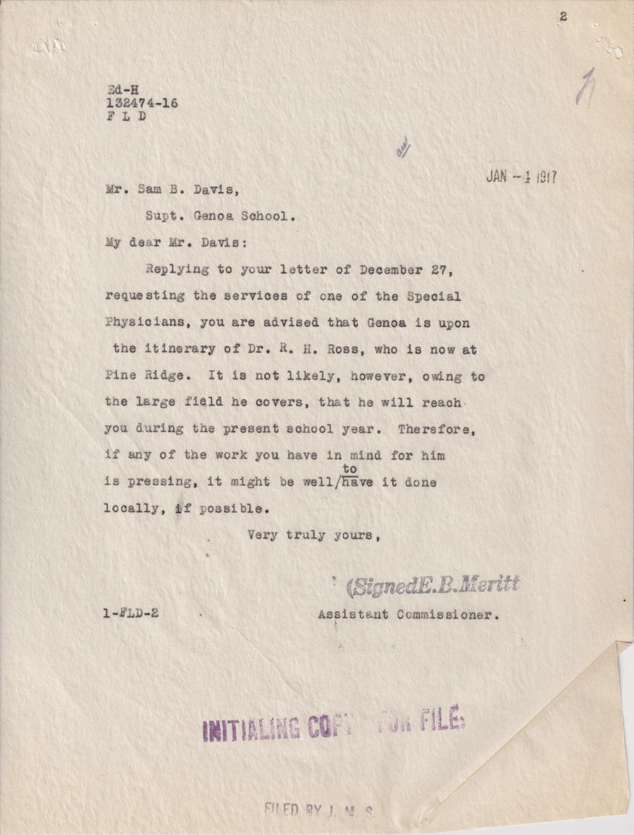 Letter from E. B. Meritt to Sam B. Davis, 4 Jan. 1917; Folder: 132474-1916-734, Box 20; Central Classified Files, 1907–1939 (NAID 300324); Office of Indian Affairs; Record Group 75; National Archives and Records Administration-Washington, DC.