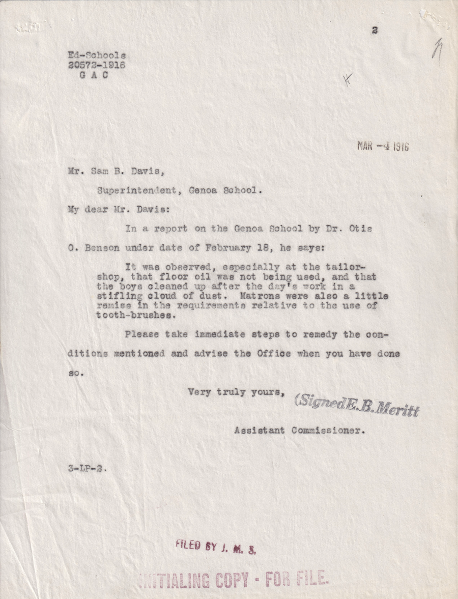 Letter from E. B. Meritt to Sam B. Davis, 4 Mar. 1916; Folder: 20572-1916-734, Box 20; Central Classified Files, 1907–1939 (NAID 300324); Office of Indian Affairs; Record Group 75; National Archives and Records Administration-Washington, DC.
