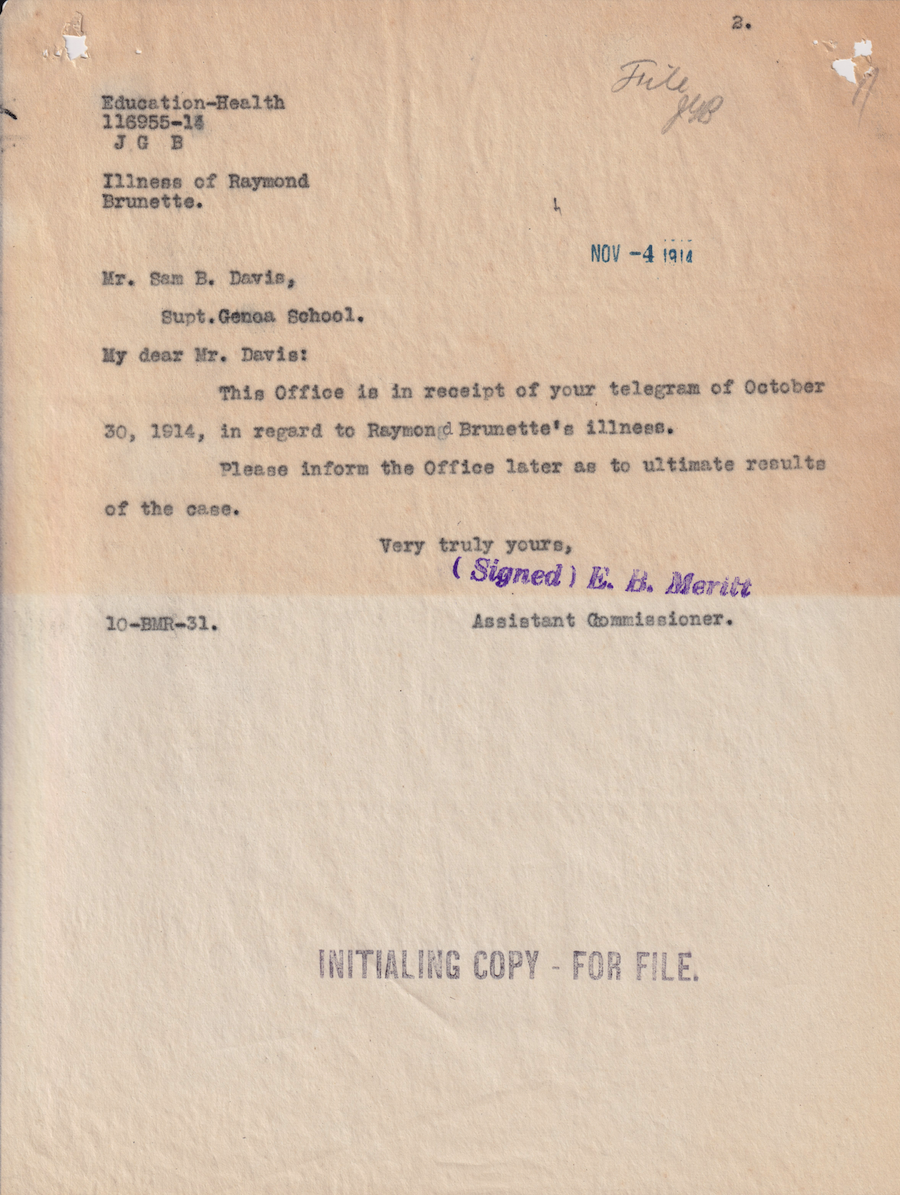 Letter from E. B. Meritt to Sam B. Davis, 4 Nov. 1914; Folder: 116955-1914-732, Box 19; Central Classified Files, 1907–1939 (NAID 300324); Office of Indian Affairs; Record Group 75; National Archives and Records Administration-Washington, DC.