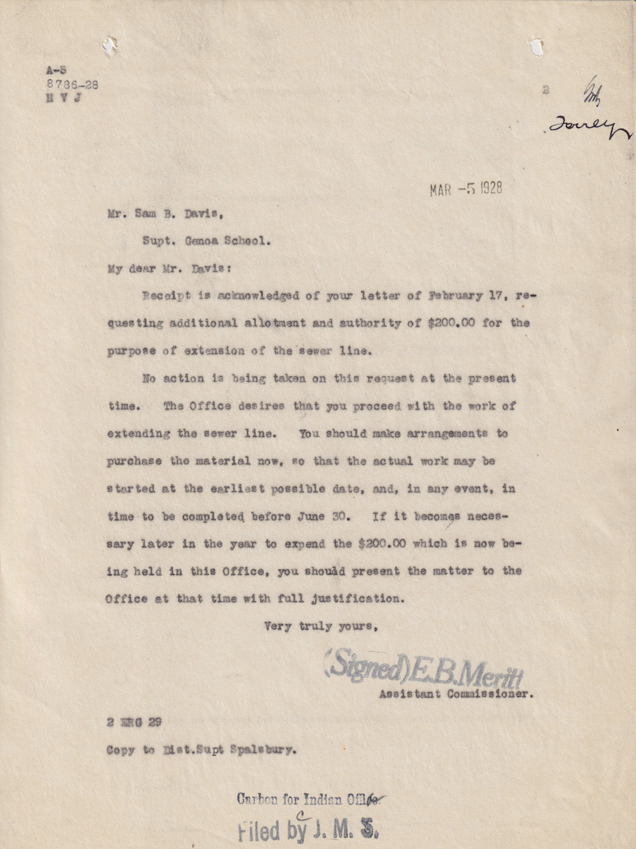 Letter from E. B. Meritt to Sam B. Davis, 5 Mar. 1928; Folder: 51800-1927-410, Box 17; Central Classified Files, 1907–1939 (NAID 300324); Office of Indian Affairs; Record Group 75; National Archives and Records Administration-Washington, DC.