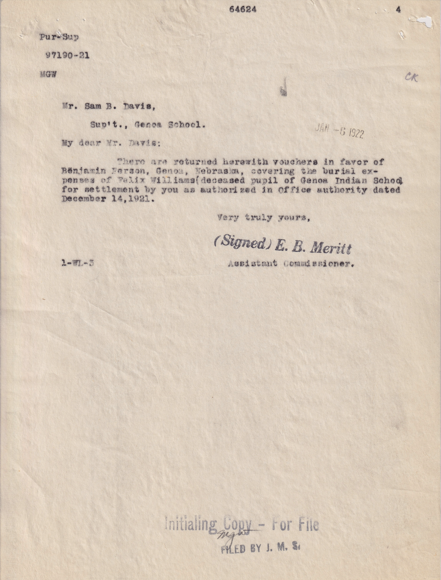 Letter from E. B. Meritt to Sam B. Davis, 6 Jan 1922; Folder: 84767-1921-736, Box 20; Central Classified Files, 1907–1939 (NAID 300324); Office of Indian Affairs; Record Group 75; National Archives and Records Administration-Washington, DC.
