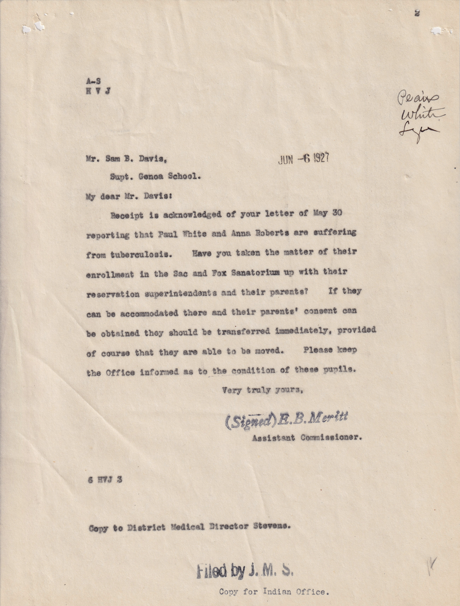 Letter from E. B. Meritt to Sam B. Davis, 6 June 1927; Folder: 29037-1927-732, Box 19; Central Classified Files, 1907–1939 (NAID 300324); Office of Indian Affairs; Record Group 75; National Archives and Records Administration-Washington, DC.