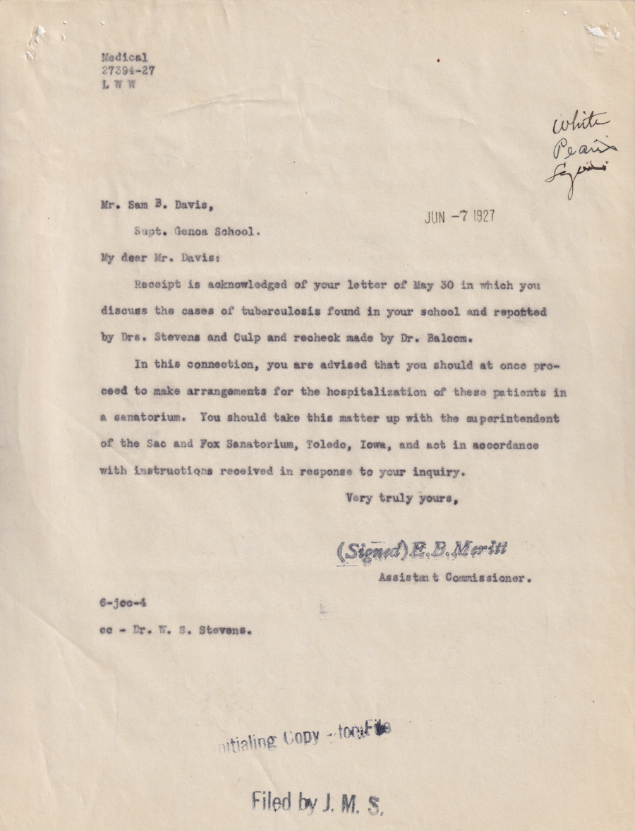 Letter from E. B. Meritt to Sam B. Davis, 7 June 1927; Folder: 27394-1927-732, Box 19; Central Classified Files, 1907–1939 (NAID 300324); Office of Indian Affairs; Record Group 75; National Archives and Records Administration-Washington, DC.