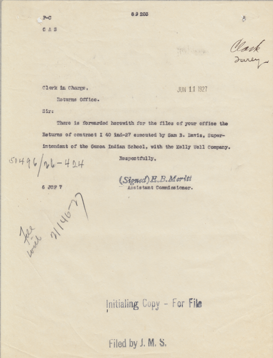 Letter from E. B. Meritt to unknown, 11 June 1927; Folder: 50496-1926-424, Box 17; Central Classified Files, 1907–1939 (NAID 300324); Office of Indian Affairs; Record Group 75; National Archives and Records Administration-Washington, DC.