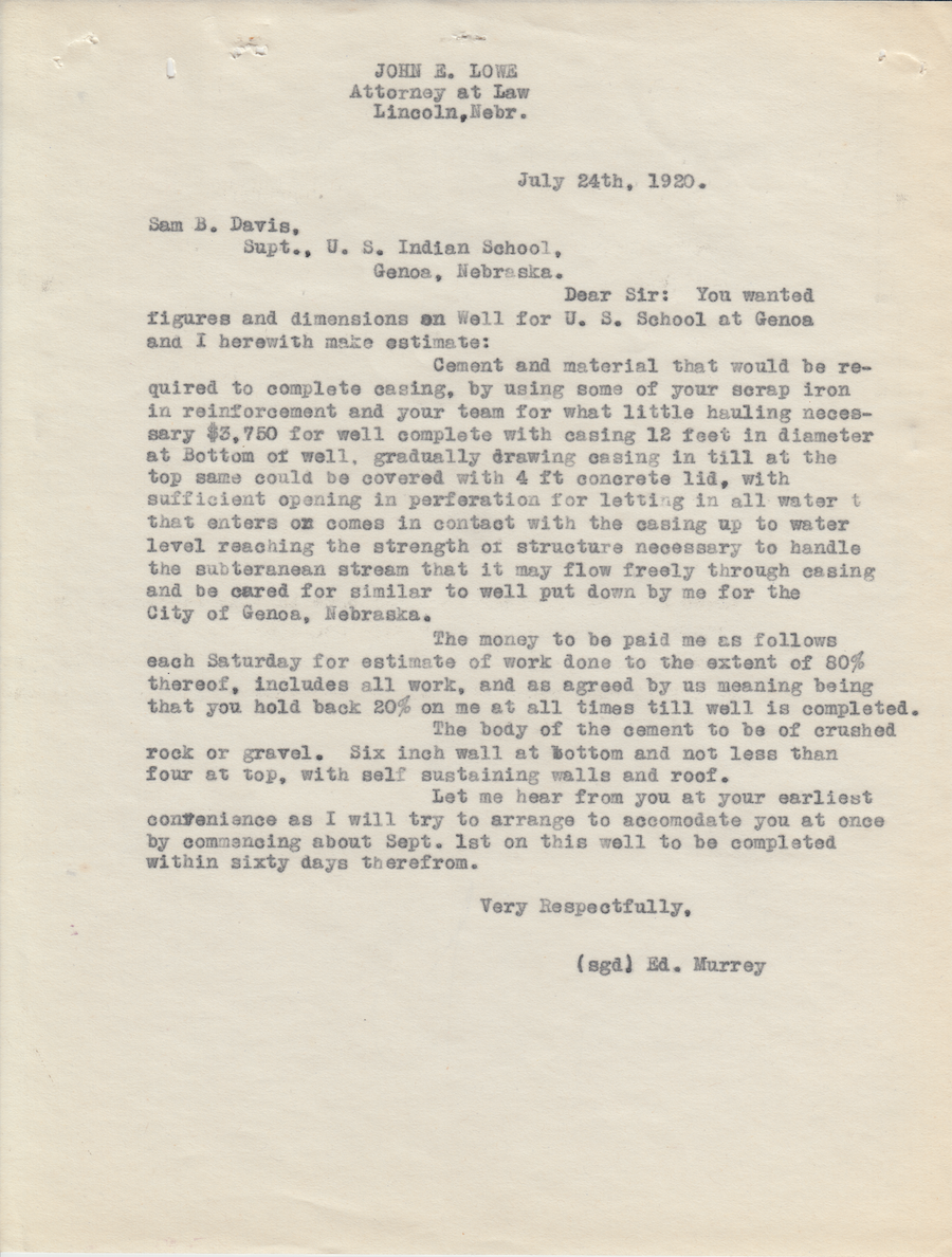 Letter from Ed. Murrey to Sam B. Davis, 24 July 1920; Folder: 72344-1920-424, Box 17; Central Classified Files, 1907–1939 (NAID 300324); Office of Indian Affairs; Record Group 75; National Archives and Records Administration-Washington, DC.