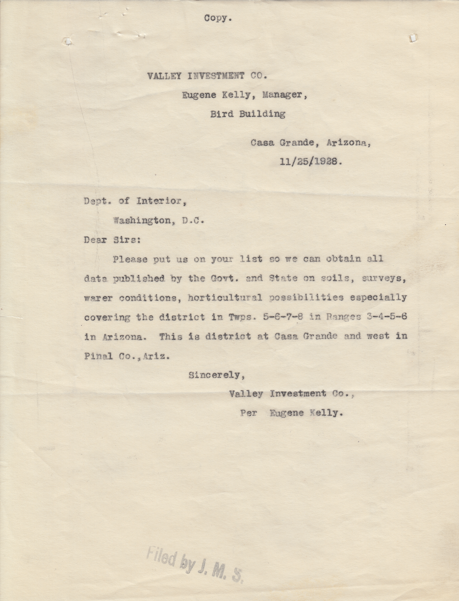 Letter from Eugene Kelly to the Dept. of Interior, 25 Nov. 1928; Folder: 50496-1926-424, Box 17; Central Classified Files, 1907–1939 (NAID 300324); Office of Indian Affairs; Record Group 75; National Archives and Records Administration-Washington, DC.