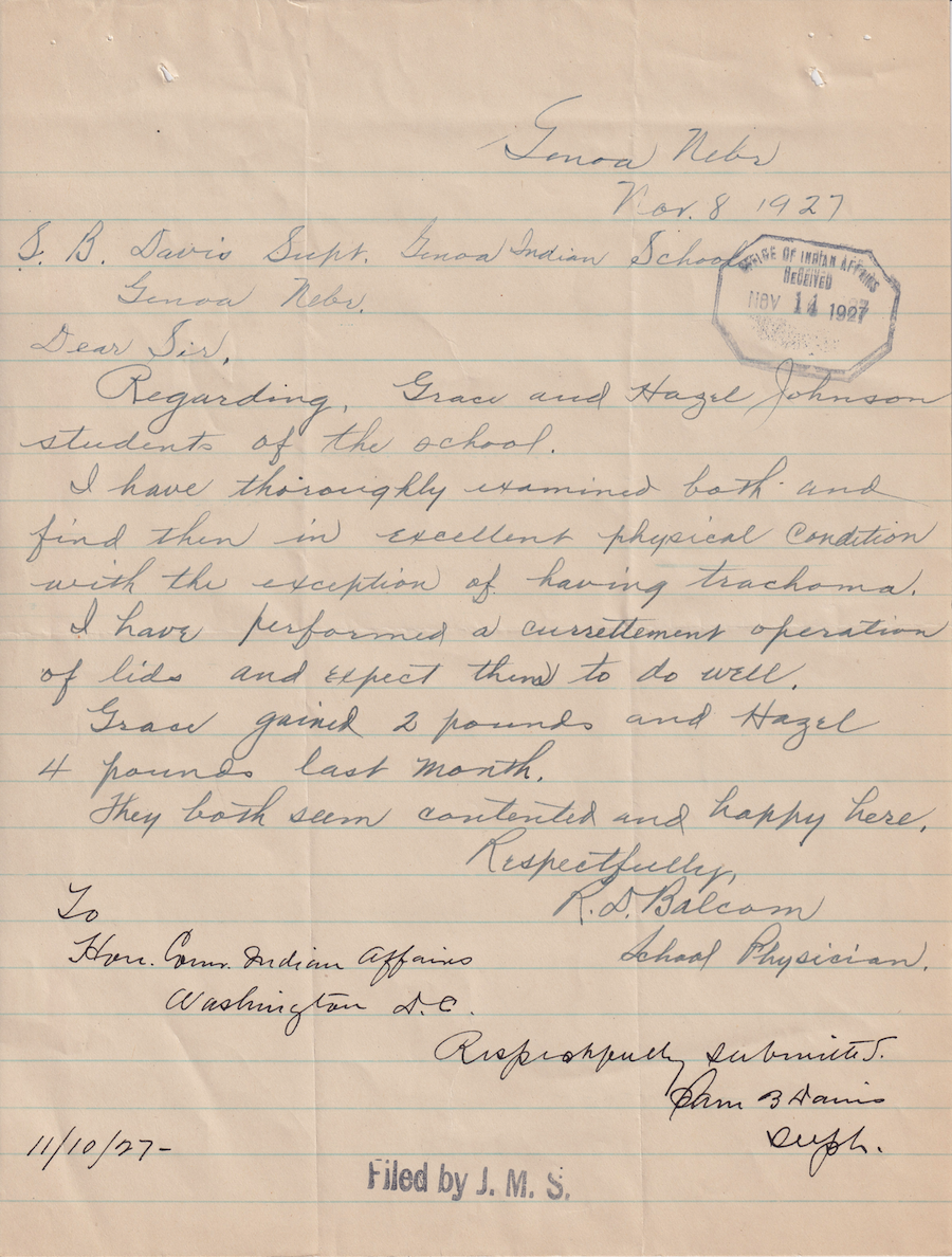 Letter form R. D. Balcom to Sam B. Davis, 8 Nov. 1927; Folder: 50475-1927-734, Box 20; Central Classified Files, 1907–1939 (NAID 300324); Office of Indian Affairs; Record Group 75; National Archives and Records Administration-Washington, DC.