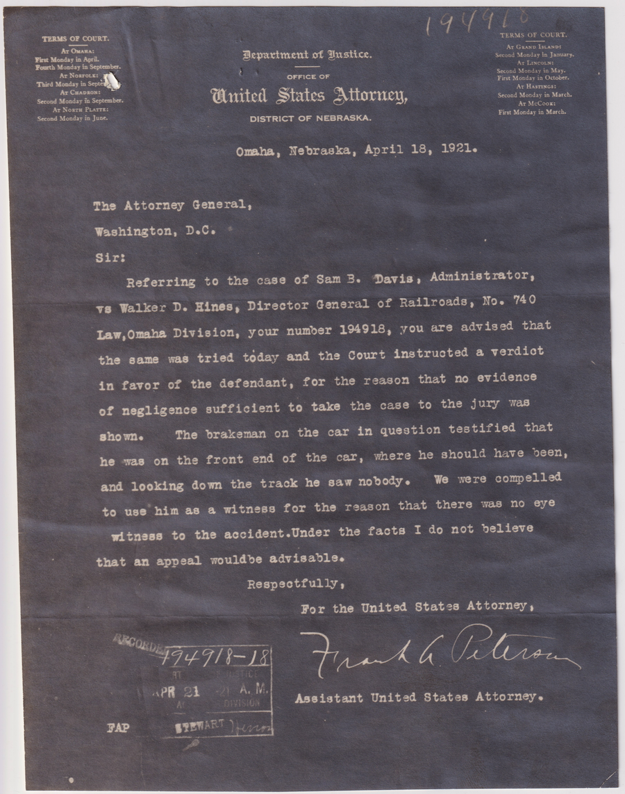 Letter from Frank A. Peterson to the Attoney General, 18 Apr. 1921; Folder: 53707-1918-736, Box 20; Central Classified Files, 1907–1939 (NAID 300324); Office of Indian Affairs; Record Group 75; National Archives and Records Administration-Washington, DC.