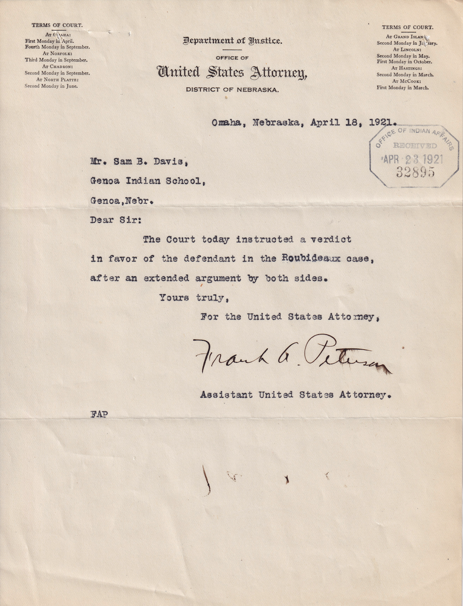 Letter from Frank A. Peterson to Sam B. Davis, 18 Apr. 1921; Folder: 53707-1918-736, Box 20; Central Classified Files, 1907–1939 (NAID 300324); Office of Indian Affairs; Record Group 75; National Archives and Records Administration-Washington, DC.