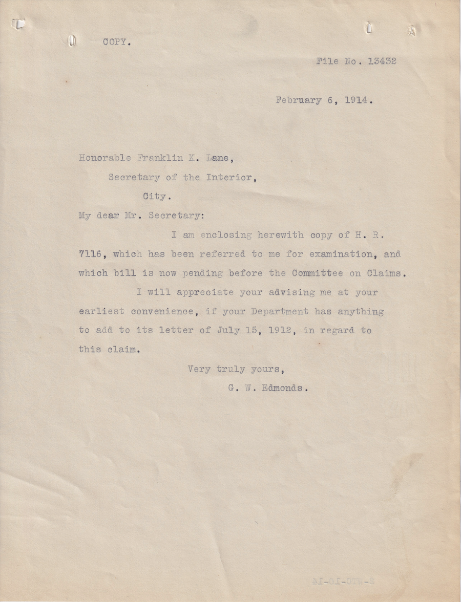 Letter from G. W. Edmonds to Franklin K. Lane, 6 Feb. 1914; Folder: 53726-1912-732, Box 19; Central Classified Files, 1907–1939 (NAID 300324); Office of Indian Affairs; Record Group 75; National Archives and Records Administration-Washington, DC.
