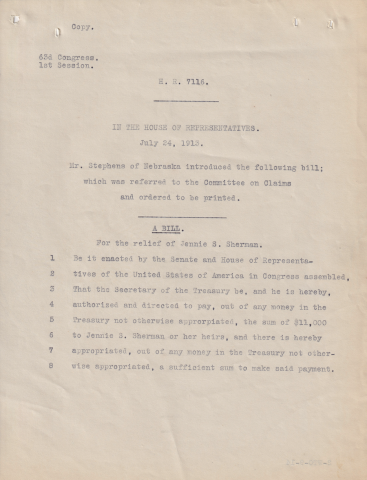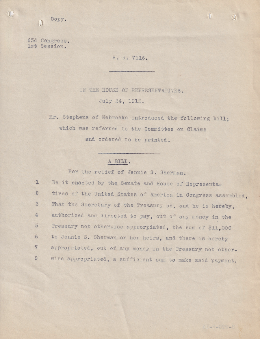 Regarding the relief of Jennie S. Sherman with $11,000 sum.Identifier: