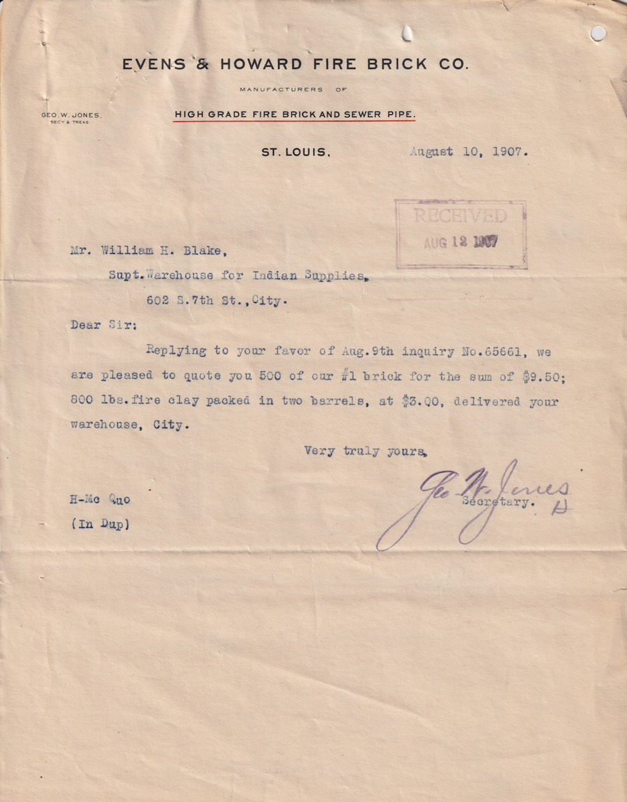 Letter from Geo W. Jones to William H. Blake, 10 Aug. 1907; Folder: 73700-1907-420, Box 17; Central Classified Files, 1907–1939 (NAID 300324); Office of Indian Affairs; Record Group 75; National Archives and Records Administration-Washington, DC.