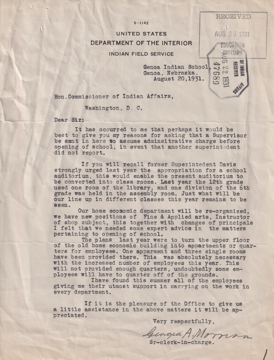 Letter from Georgia A. Morrison to the Commissioner of Indian Affairs, 20 Aug. 1931; Folder: 47689-1931-806, Box 21; Central Classified Files, 1907–1939 (NAID 300324); Office of Indian Affairs; Record Group 75; National Archives and Records Administration-Washington, DC.