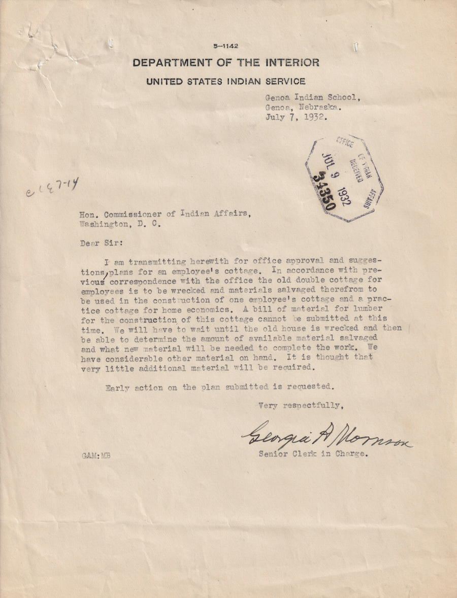 Letter from Georgia A. Morrison to the Commissioner of Indian Affairs, 7 July 1932; Folder: 17456-1932-410, Box 17; Central Classified Files, 1907–1939 (NAID 300324); Office of Indian Affairs; Record Group 75; National Archives and Records Administration-Washington, DC.