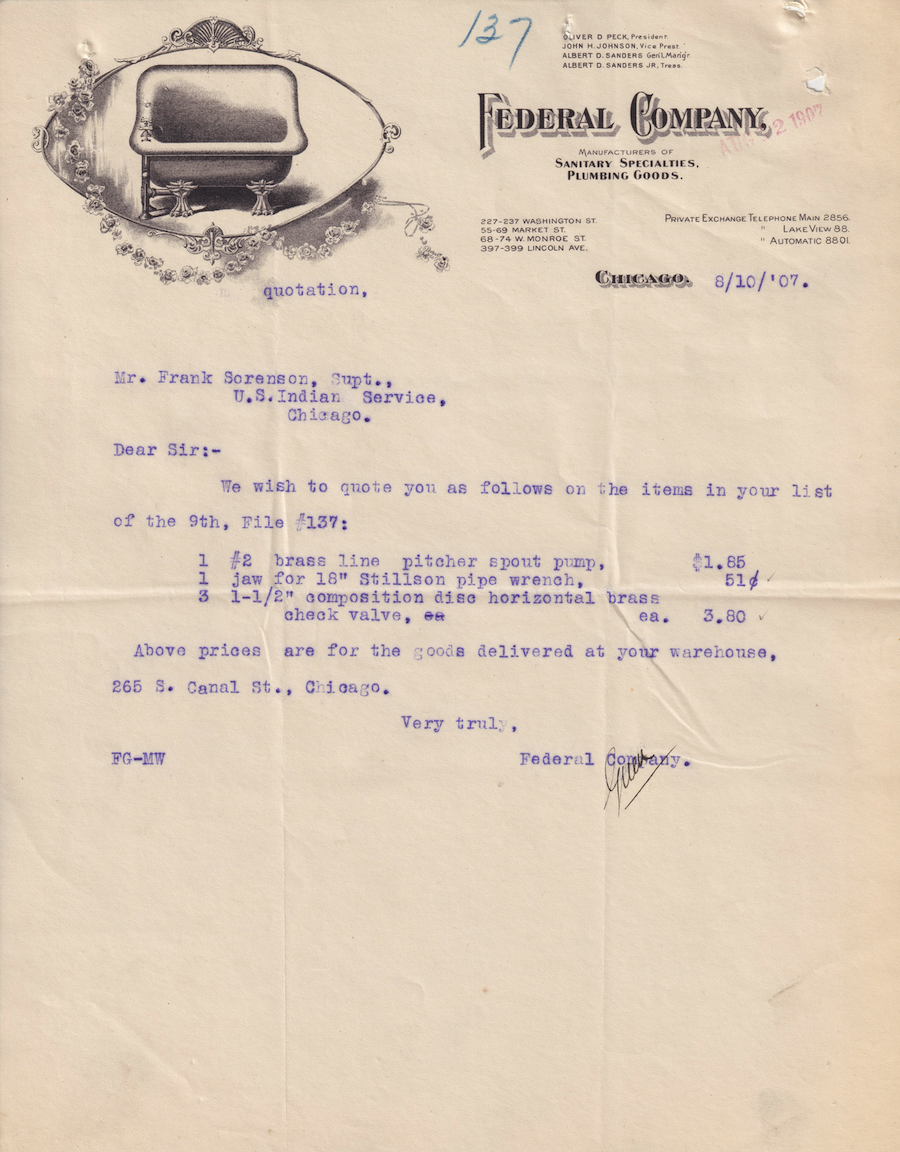 Letter from Green to Frank Sorenson, 10 Aug. 1907; Folder: 73700-1907-420, Box 17; Central Classified Files, 1907–1939 (NAID 300324); Office of Indian Affairs; Record Group 75; National Archives and Records Administration-Washington, DC.