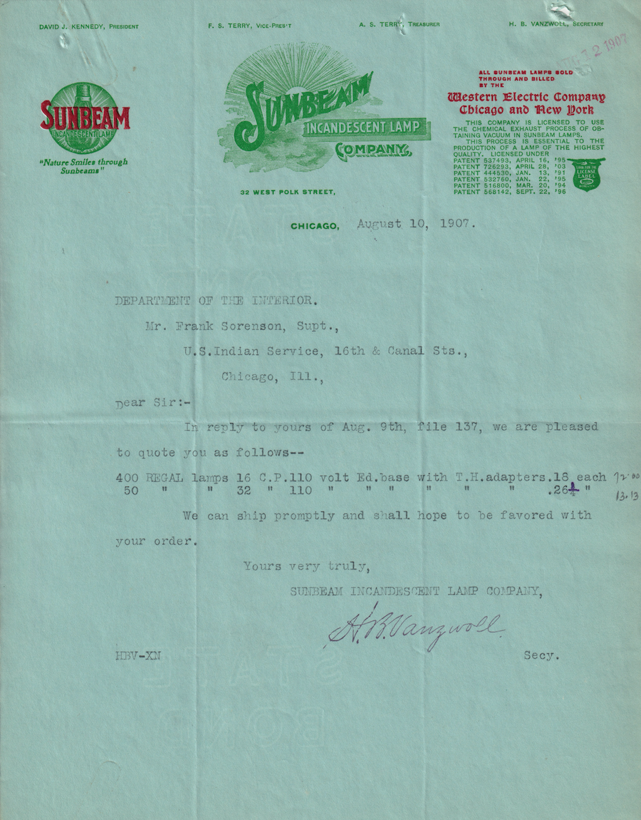 Letter from H. B. Vanzwoll to Frank Sorenson, 10 Aug. 1907; Folder: 73700-1907-420, Box 17; Central Classified Files, 1907–1939 (NAID 300324); Office of Indian Affairs; Record Group 75; National Archives and Records Administration-Washington, DC.