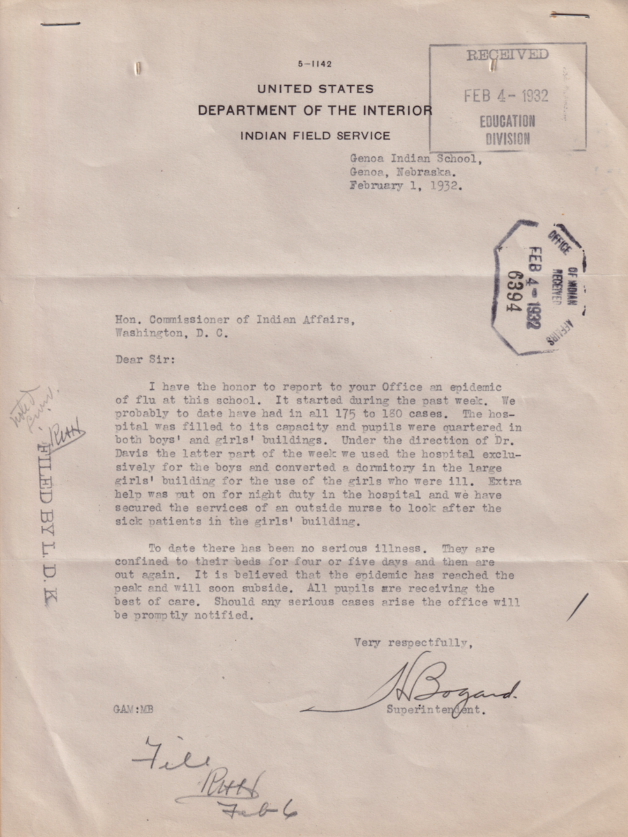 Letter from H. Bogard to the Commissioner of Indian Affairs, 1 Feb. 1932; Folder: 6394-1932-731, Box 19; 6394-1932-731; Central Classified Files, 1907–1939 (NAID 300324); Office of Indian Affairs; Record Group 75; National Archives and Records Administration-Washington, DC.