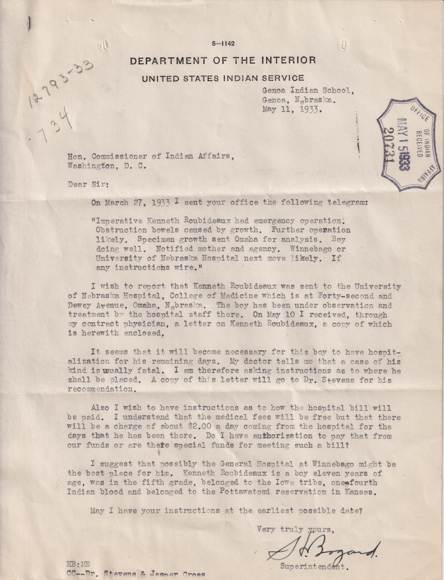 Letter from H. Bogard to Commissioner of Indian Affairs, 11 May 1933; Folder: 12793-1933-734, Box 20; Central Classified Files, 1907–1939 (NAID 300324); Office of Indian Affairs; Record Group 75; National Archives and Records Administration-Washington, DC.