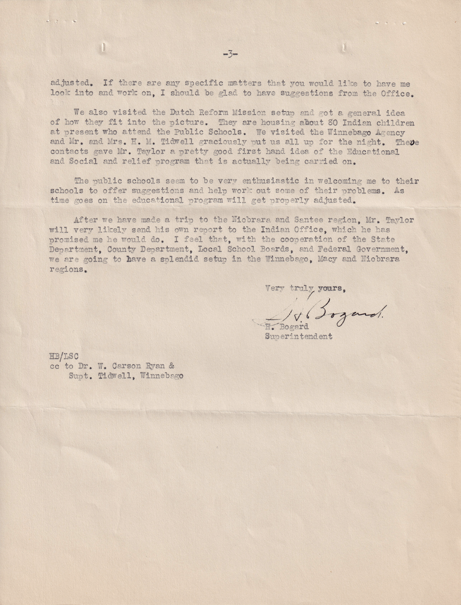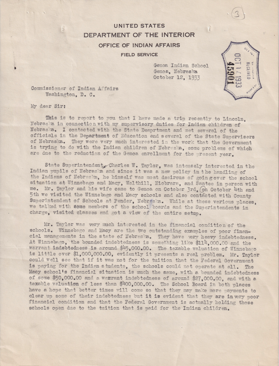 Letter from H. Bogard to Commissioner of Indian Affairs, 12 Oct. 1933; Folder: 45901-1933-803, Box 20; Central Classified Files, 1907–1939 (NAID 300324); Office of Indian Affairs; Record Group 75; National Archives and Records Administration-Washington, DC.