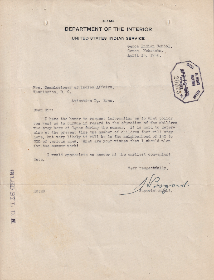 Letter from H. Bogard to Commissioner of Indian Affairs, 13 Apr. 1932; Folder: 20075-1932-806, Box 21; Central Classified Files, 1907–1939 (NAID 300324); Office of Indian Affairs; Record Group 75; National Archives and Records Administration-Washington, DC.