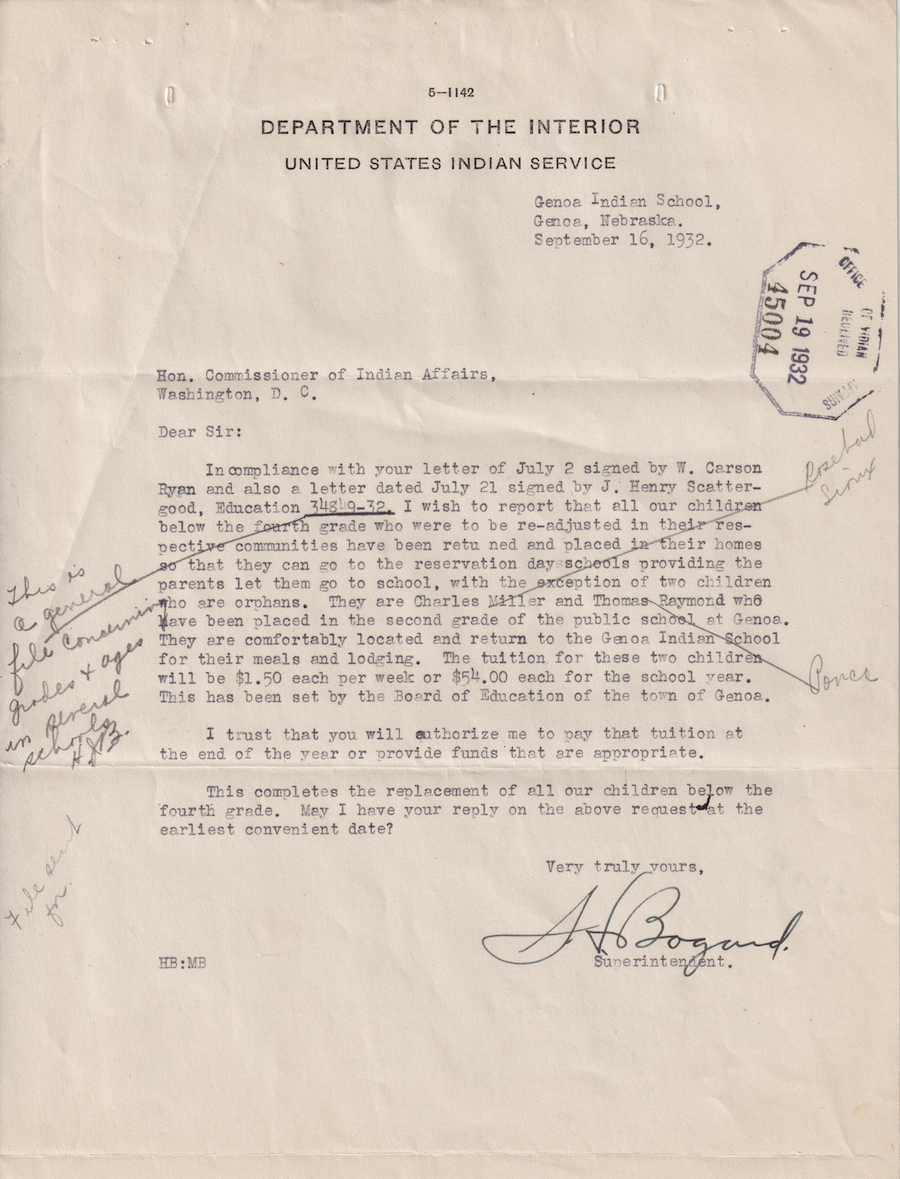 Letter from H. Bogard to Commissioner of Indian Affairs, 16 Sept. 1932