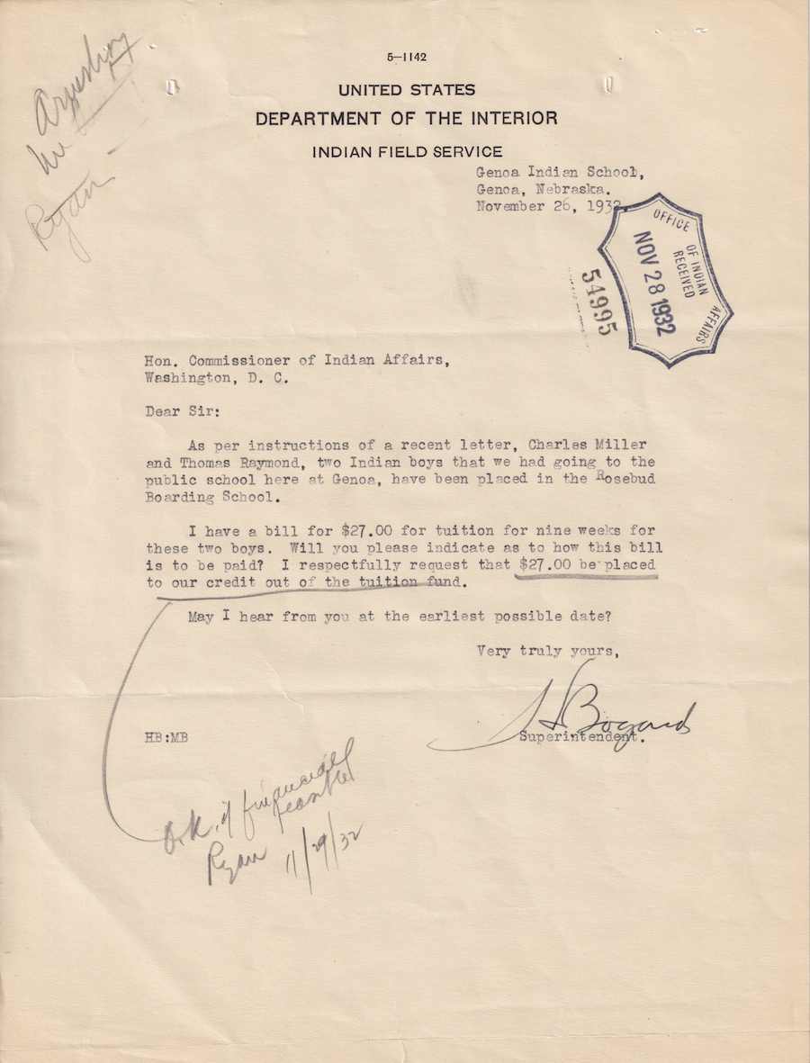 Letter from H. Bogard to Commissioner of Indian Affairs, 26 Nov. 1932; Folder: 54995-1932-803, Box 20; Central Classified Files, 1907–1939 (NAID 300324); Office of Indian Affairs; Record Group 75; National Archives and Records Administration-Washington, DC.