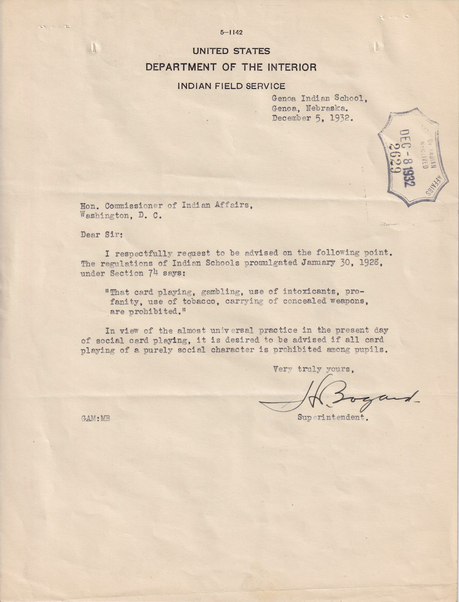 Letter from H. Bogard to Commissioner of Indian Affairs, 5 Dec. 1932; Folder: 2629-1933-750, Box 20; Central Classified Files, 1907–1939 (NAID 300324); Office of Indian Affairs; Record Group 75; National Archives and Records Administration-Washington, DC.