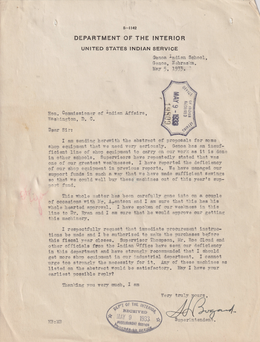 Letter from H. Bogard to the Commissioner of Indian Affairs, 5 May 1933; Folder: 19809-1933-420, Box 17; Central Classified Files, 1907–1939 (NAID 300324); Office of Indian Affairs; Record Group 75; National Archives and Records Administration-Washington, DC.