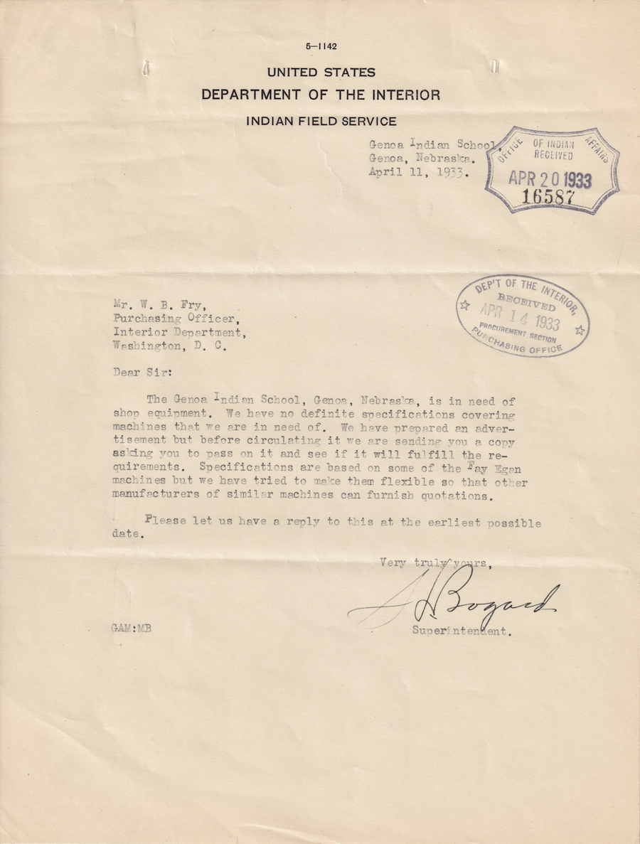 Letter from H. Bogard to W. B. Fry, 11 Apr. 1933; Folder: 16587-1933-420, Box 17; Central Classified Files, 1907–1939 (NAID 300324); Office of Indian Affairs; Record Group 75; National Archives and Records Administration-Washington, DC.