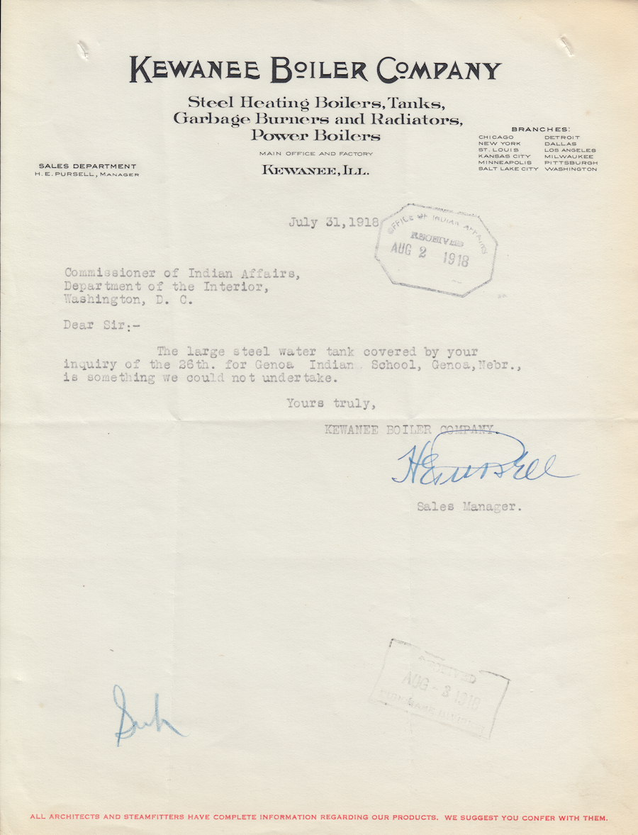 Letter from H. E. Pursell to the Commissioner of Indian Affairs, 31 July 1918; Folder: 83054-1917-424, Box 17; Central Classified Files, 1907–1939 (NAID 300324); Office of Indian Affairs; Record Group 75; National Archives and Records Administration-Washington, DC.