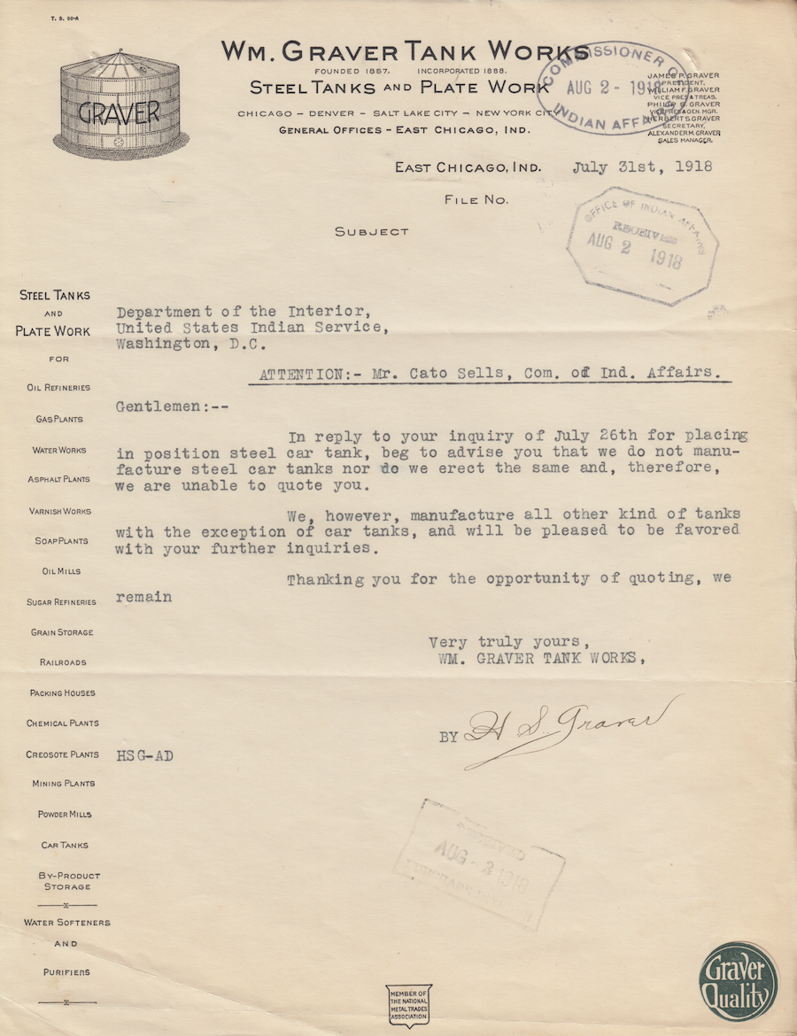 Letter from Herbert S. Graver to Cato Sells, 31 July 1918; Folder: 83054-1917-424, Box 17; Central Classified Files, 1907–1939 (NAID 300324); Office of Indian Affairs; Record Group 75; National Archives and Records Administration-Washington, DC.