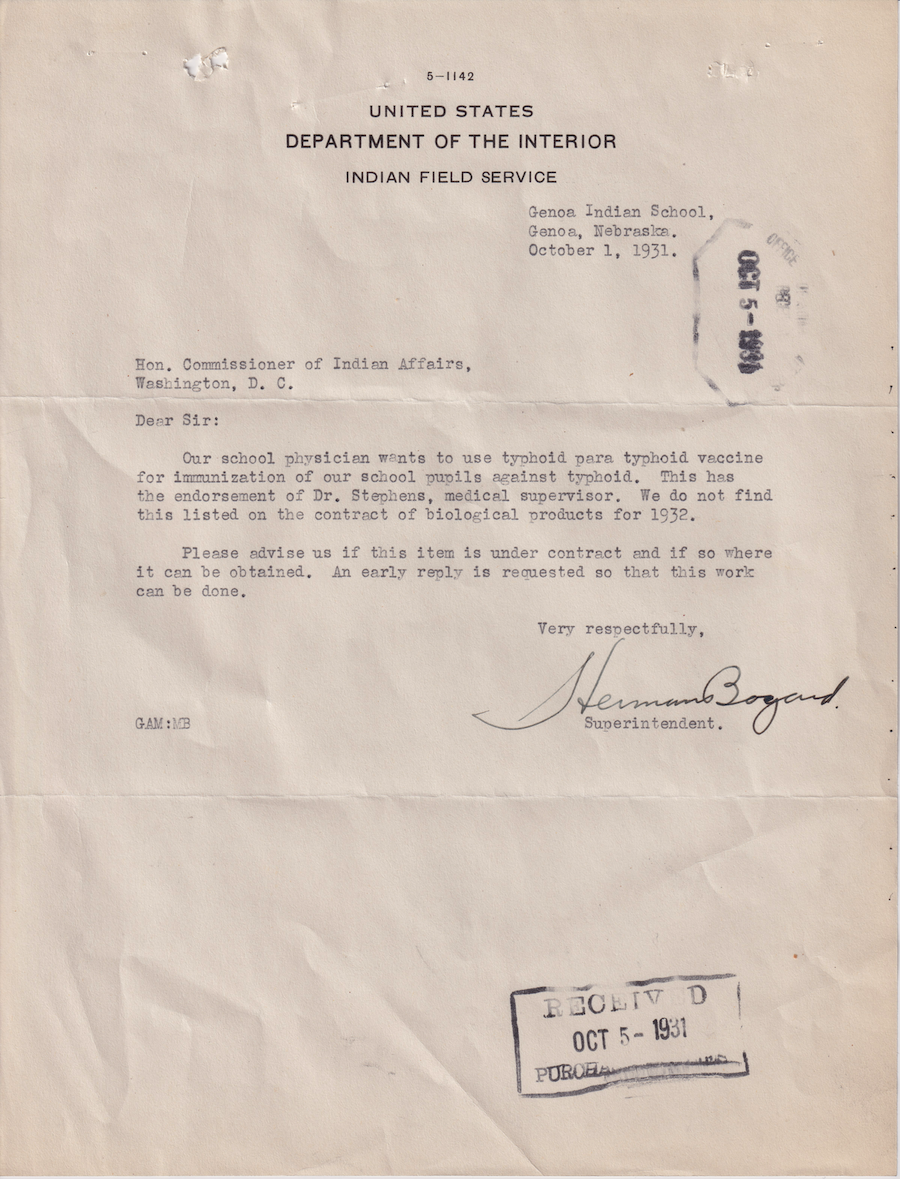 Letter from Herman Bogard to Commissioner of Indian Affairs, 1 Oct. 1931; Folder: 00-1931-734, Box 20; Central Classified Files, 1907–1939 (NAID 300324); Office of Indian Affairs; Record Group 75; National Archives and Records Administration-Washington, DC.
